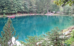 Von hieraus startenten wir eine Radtour zum Blausee. Nachdem man am Eingang des Naturparks ein Ticket gekauft hat, kann man über schöne Wanderwege zum Blausee laufen. An der ersten Ausblickstelle sieht man den See von oben. Über einen Trampelpfad kann man dann auch zum See hinunter laufen. Das haben wir dann auch getan.