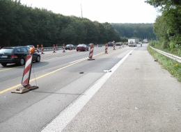 Am Anfang einer Autobahnbaustelle wurden zwei Fahrbahnstreifen mit Warnbaken getrennt. Ein schwarzer offener Sportwagen mit einem Schweizer Kennzeichen überholte uns mit hohem Tempo und konnte seine Spur nicht halten. Er traf mit seiner Stoßstange eine der Baken. Diese wurde in die Luft geschleudert und traf unser Wohnmobil an der vorderen linken Seite.
